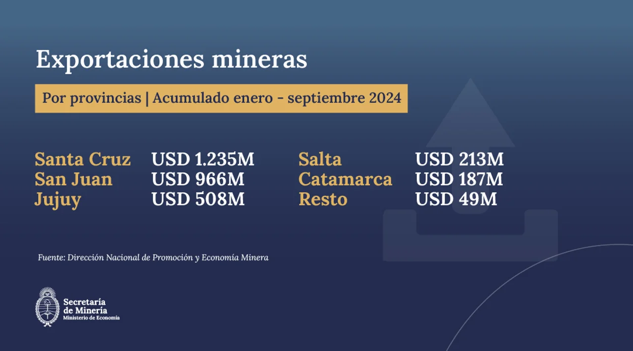 Del total exportado por la minería en septiembre 2024, el 98,8% fue acaparado por 5 provincias: Santa Cruz, San Juan, Jujuy, Catamarca y Salta, con una clara preponderancia de las provincias del norte del país.